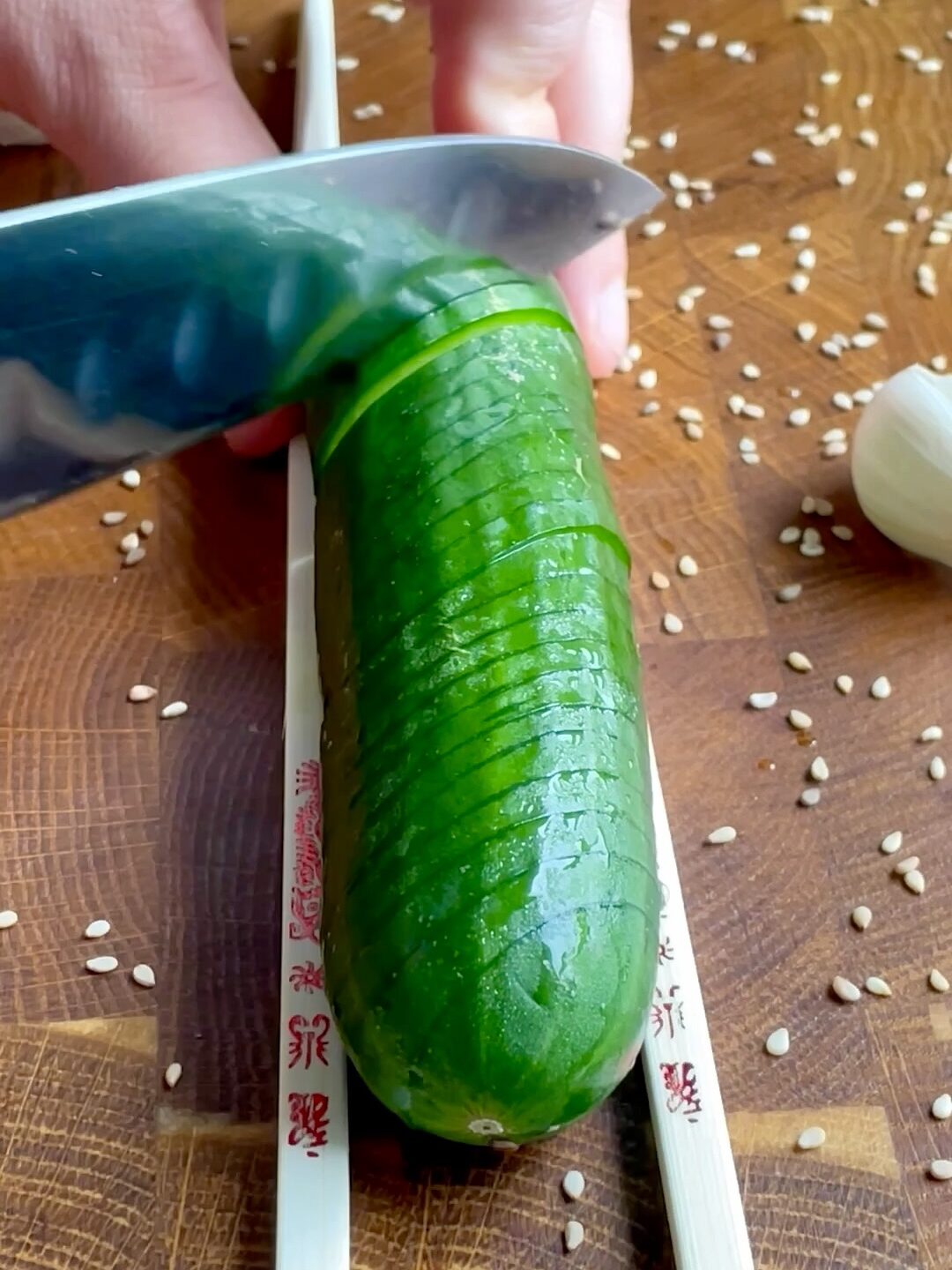 - Place each cucumber between two chopsticks or wooden spoons. Slice at a 45° angle without cutting all the way through. Flip it and slice straight down to create spiral cuts that soak up the dressing beautifully.