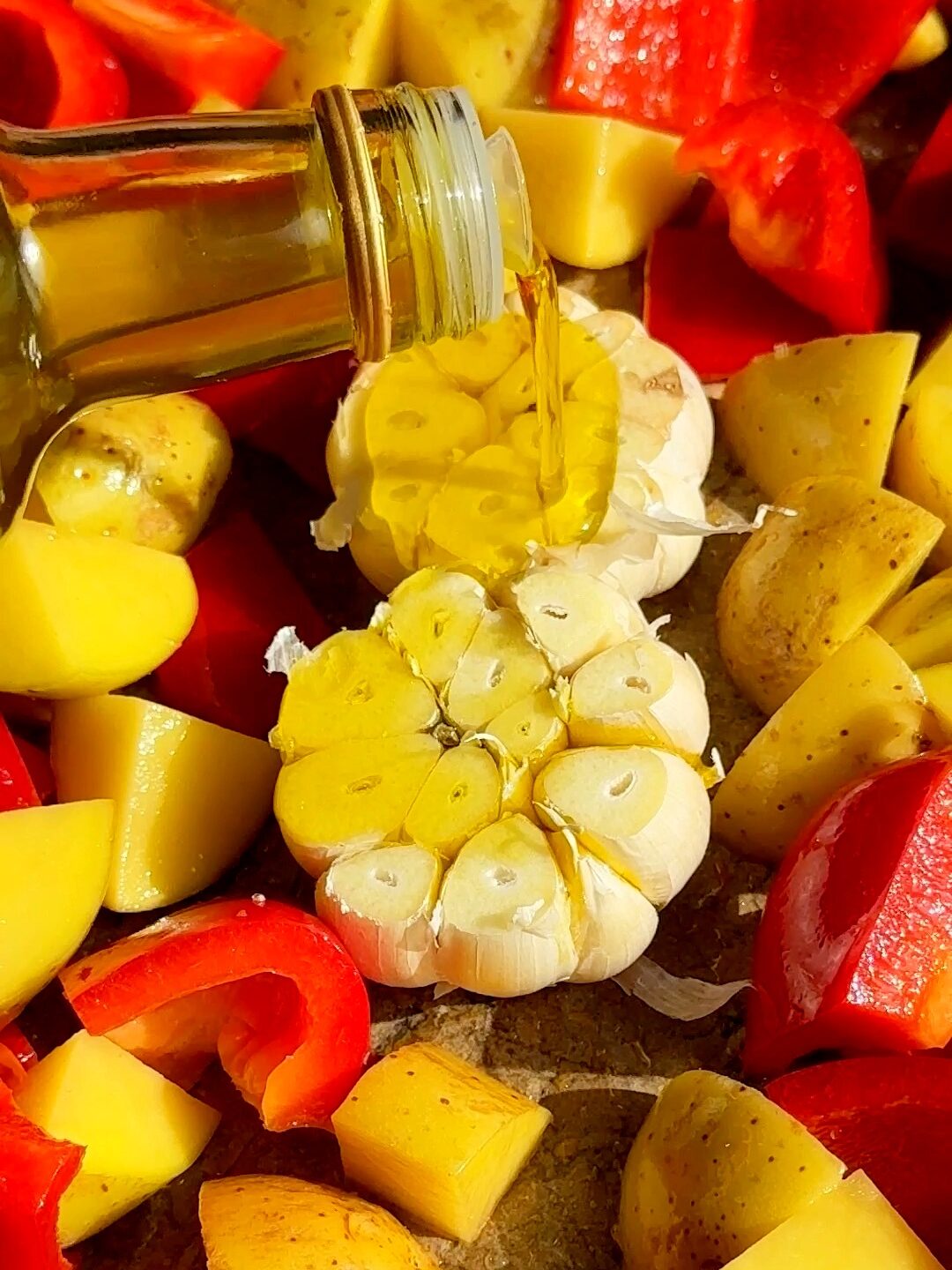 - Take the heads of garlic and slice off the tops to expose the cloves. Drizzle a little olive oil over each head of garlic. Place them on the baking tray with the potatoes and peppers.