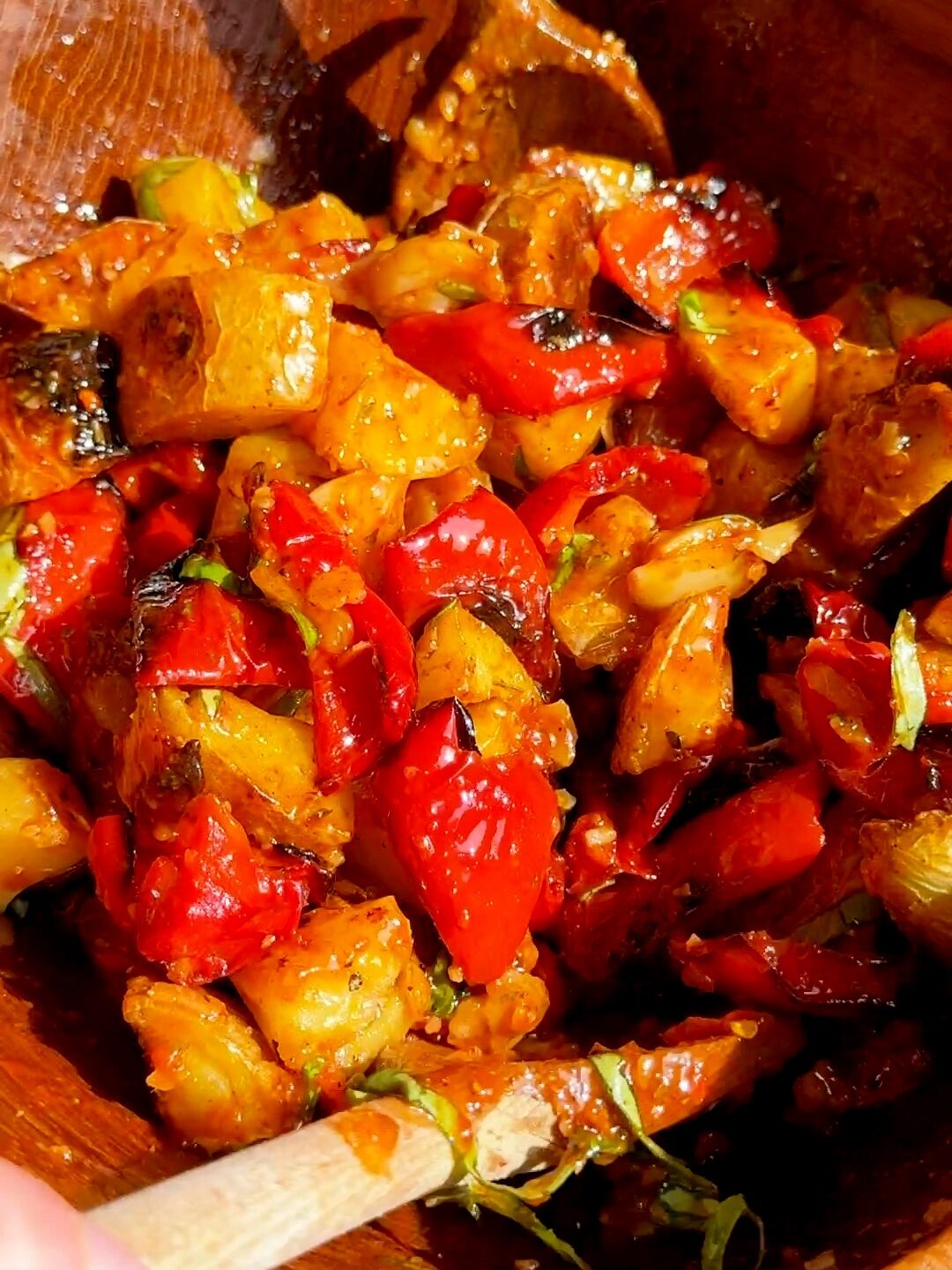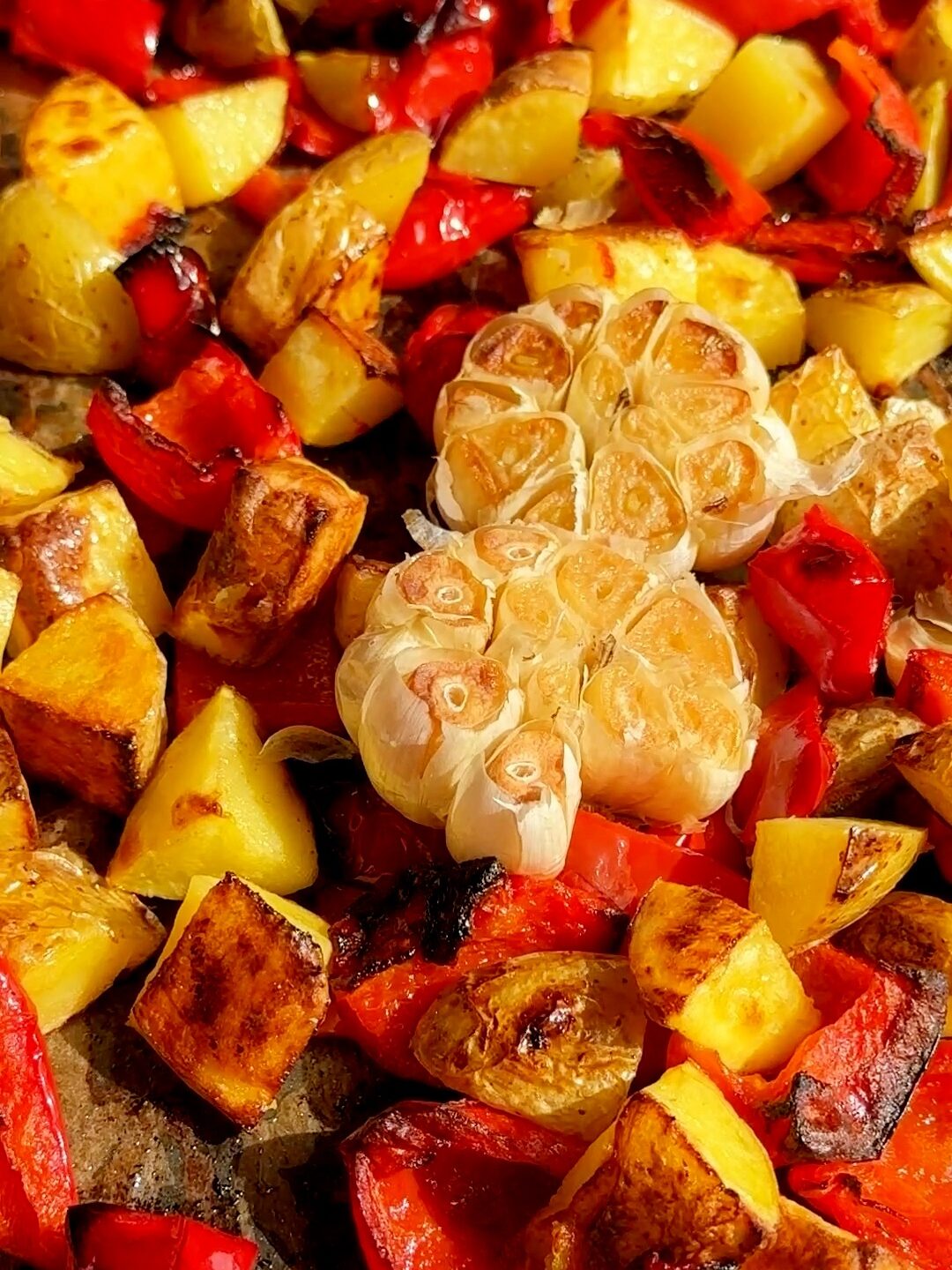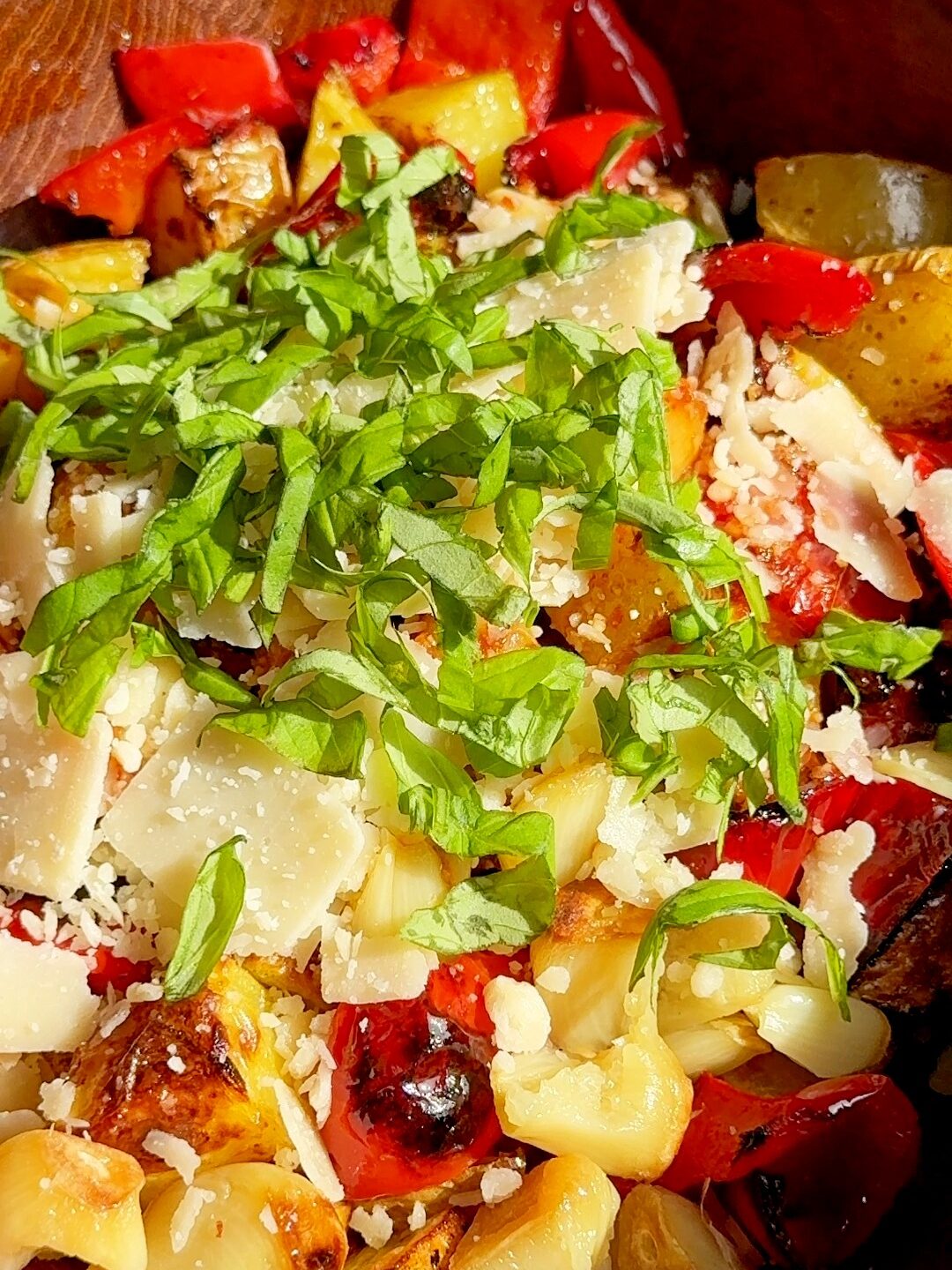 Picture this: tender chunks of potatoes, roasted to perfection, mingling with vibrant strips of peppers, all coated in a luscious dressing that’s both tangy and sweet, with just the right amount of heat. But that’s not all – the addition of roasted garlic adds a depth of flavor that takes this salad to a whole new level. And let’s not forget the finishing touch – delicate shavings of Parmigiano cheese and fragrant basil leaves, adding a touch of elegance to every bite.es.
